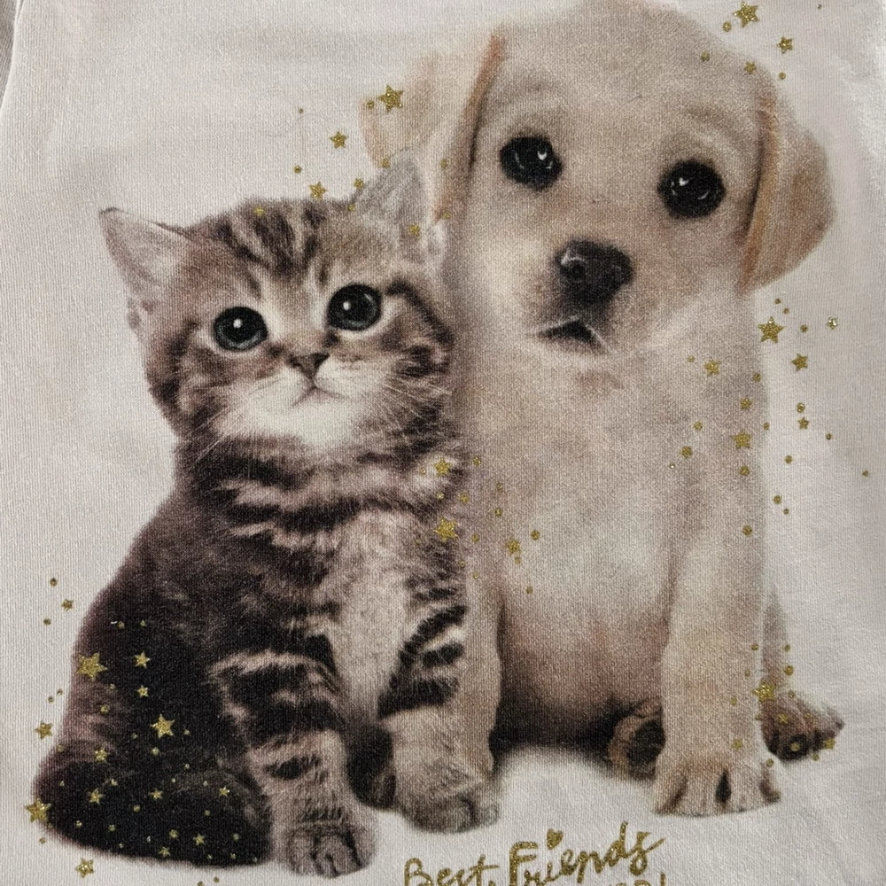 Ez a H&M márkájú, cicás és kutyás mintával díszített felső vidám, játékos darab a 2–4 éves kislányok ruhatárába. A bézs színű alapot csillogó aranyszínű csillagok és a „Best Friends Forever” felirat teszik különlegessé.