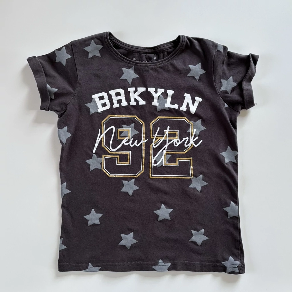 140-es sötétszürke csillagos „BRKLYN New York” pamut póló kislánynak – Primark, 9–10 év
