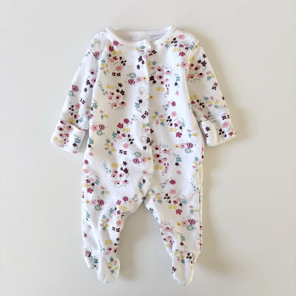 56-os Matalan pamut virágmintás rugdalózó kislánynak – Up to 1 mth