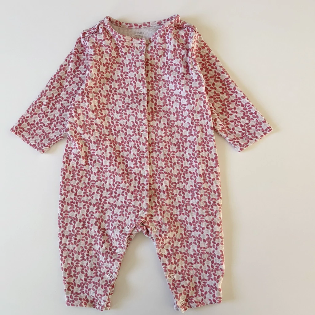 Hibátlan állapotú, 95% pamut és 5% elasztán anyagú, bordázott virágmintás rugdalózó overall kislányoknak. Kényelmes, rugalmas és puha anyagból, akár egybepizsamaként is viselhető.