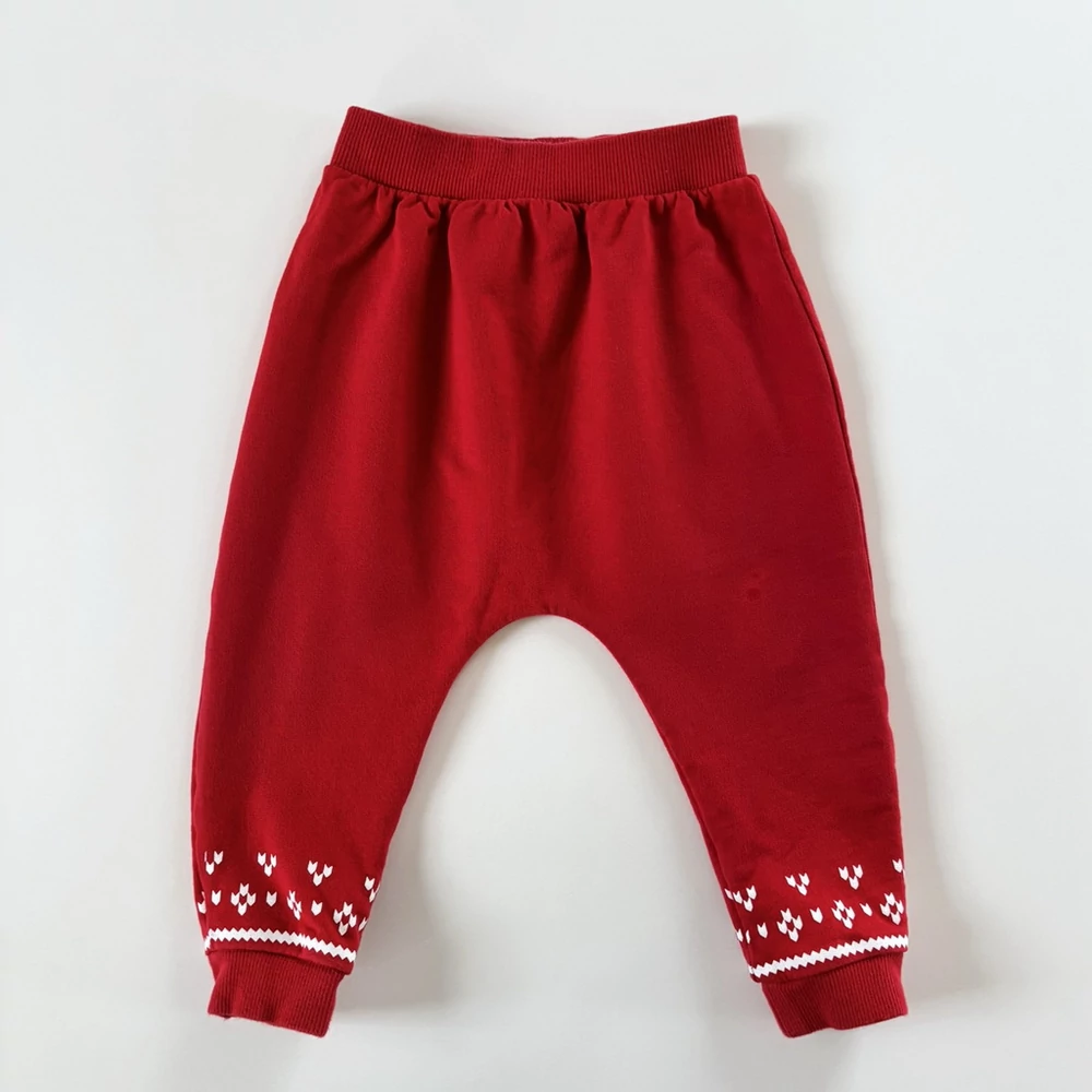 Ez a Next márkájú piros karácsonyi nadrág igazi ünnepi hangulatot varázsol a baba öltözetébe. Alsó szárán fehér mintás díszítés teszi még különlegesebbé. A nadrág unisex fazonú, így kislányok és kisfiúk számára egyaránt tökéletes választás.