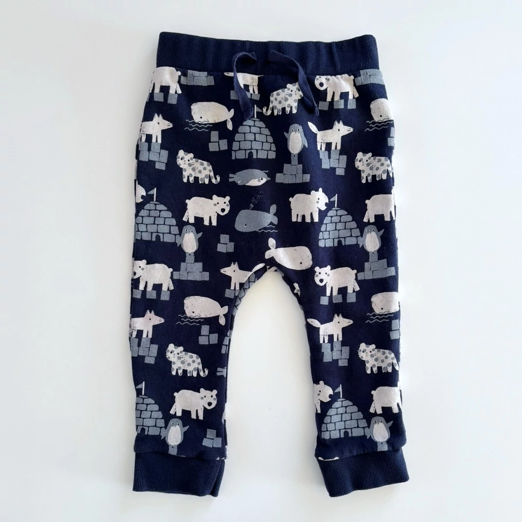 A sötétkék alapot vidám állatminták díszítik – jegesmedvék, fókák, pingvinek és bálnák – melyek a gyerekek fantáziáját is megmozgatják. A nadrág rugalmas derékrésze kényelmes, a megkötője csak dísz, így nem kell bajlódni a bekötéssel.